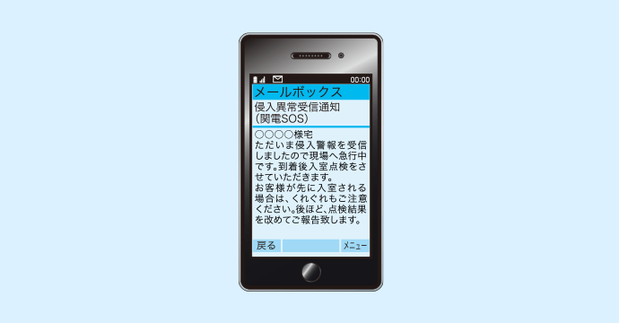 ご自宅の異常を検知したら、即座に携帯電話にメール通知。帰宅した際、侵入されていることに気づかずに部屋に入って侵入者と出くわしたり、部屋の中で待ち伏せされるなど危険に遭遇する心配がなくなります。