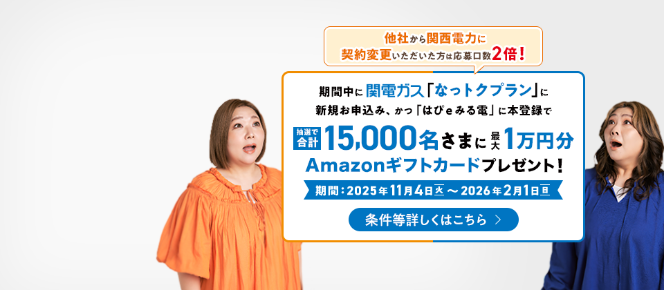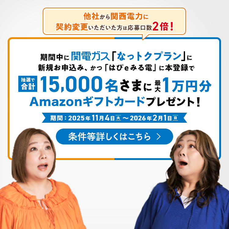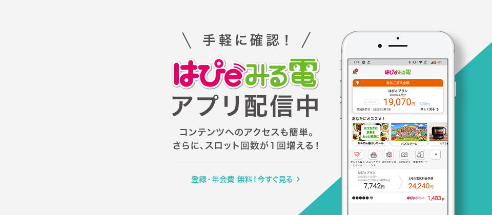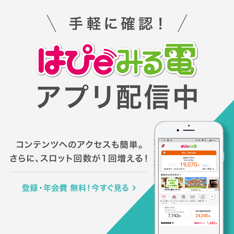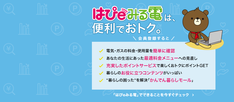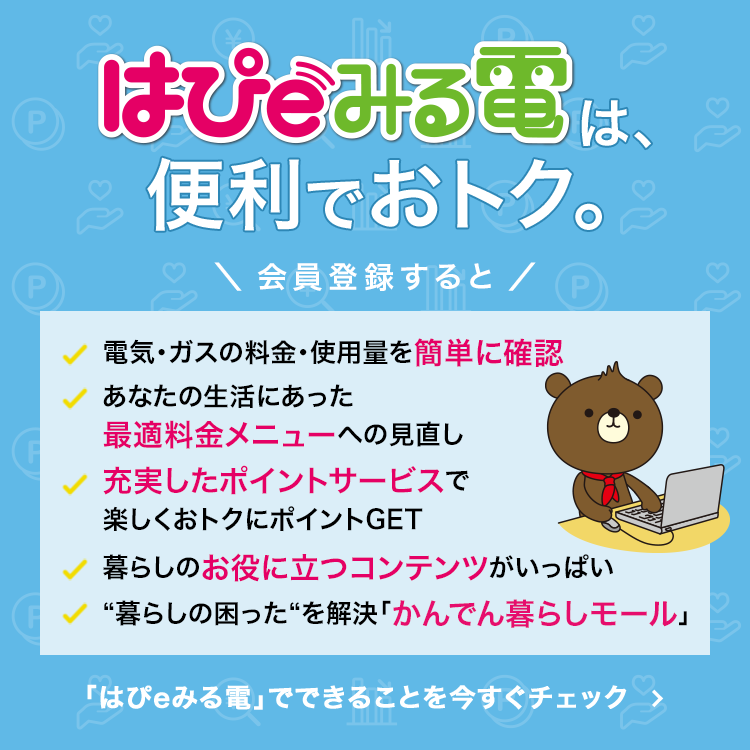 はぴeみる電トップ IDをお持ちの方 ログイン情報を保持する ログイン IDまたはパスワードを忘れた方はこちら その他のアカウントでログイン IDをお持ちでない方 新規登録 ログイン(新規登録) 「はぴeみる電」会員なら もっと便利、もっとお得! 電気・ガス料金がWeb上で いつでも確認できる! 最大過去25ヶ月の電気・ガス料金や使用量を分かりやすいグラフでチェックすることができます。また、月単位だけではなく、1日ごと・1時間ごとの使用量をチェックすることができます。 さらに、前日までの概算料金の表示に加え、次回検針日までの1ヶ月分の想定料金を表示します。 続きをみる+ 閉じる- 電気・ガス料金の 見直し・省エネ 電気・ガス料金メニューの変更シミュレーションや省エネに関するサービスをご紹介します。 続きをみる+ 閉じる- はぴeポイントがたまる!つかえる! 電気・ガスのご使用に応じたポイントや各種コンテンツのご利用によるポイントが簡単に、おトクにためていただくことができます。 また、電気・ガスへのお支払いや400種類以上のアイテム・他社ポイントへの交換、地域を盛り上げ社会に貢献することを目的とした活動への応援等に幅広くお使いいただくことができます。 続きをみる+ 閉じる- 暮らしのお役立ちサービス \はぴeみる電会員さま限定!/暮らしに役立つ、さまざまなサービスをご紹介します。 続きをみる+ 閉じる- 「はぴeみる電」についてもっと知る 「はぴeみる電」でできること 「はぴeみる電」よくあるご質問 お知らせ 2025年11月05日 キャンペーン オール電化キャンペーン実施中! 2025年11月05日 キャンペーン 「電気もガスも関西電力!」 抽選でAmazonギフトカード当たる! 一覧をみる おすすめのサービス・キャンペーン お困りのとき・各種お手続き お困りのとき 各種お手続き はぴeでんきの駆けつけサービス ガス漏れを感じたとき 停電情報 雷情報 よくあるご質問 引っ越しのお手続き 他社からの切り替え(電気) 他社からの切り替え(ガス) 支払い方法に関するお手続き 電気の契約メニューのご変更 送電再開のお手続き お困りのとき 各種お手続き はぴeでんきの駆けつけサービス ガス漏れを感じたとき 停電情報 雷情報 よくあるご質問 引っ越しのお手続き 他社からの切り替え(電気) 他社からの切り替え(ガス) 支払い方法に関するお手続き 電気の契約メニューのご変更 送電再開のお手続き