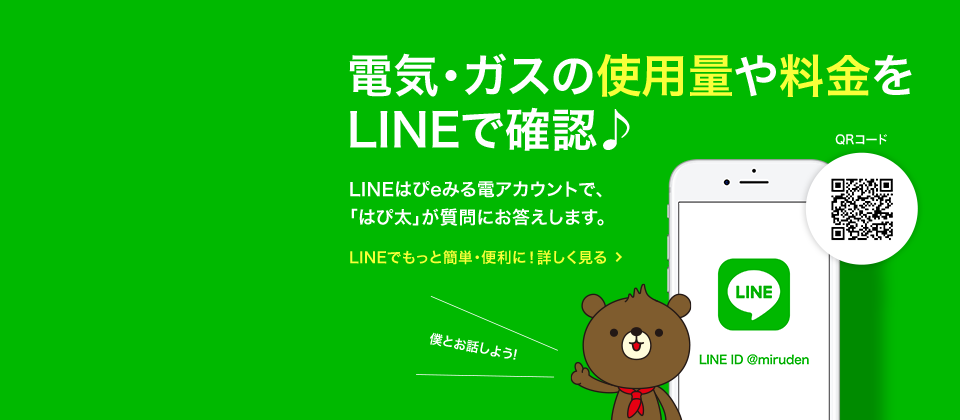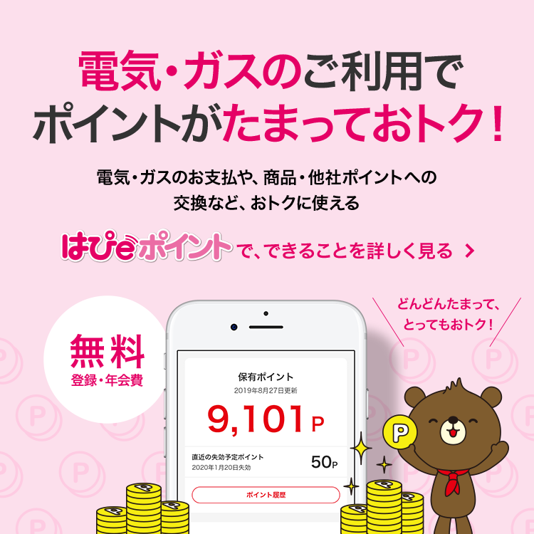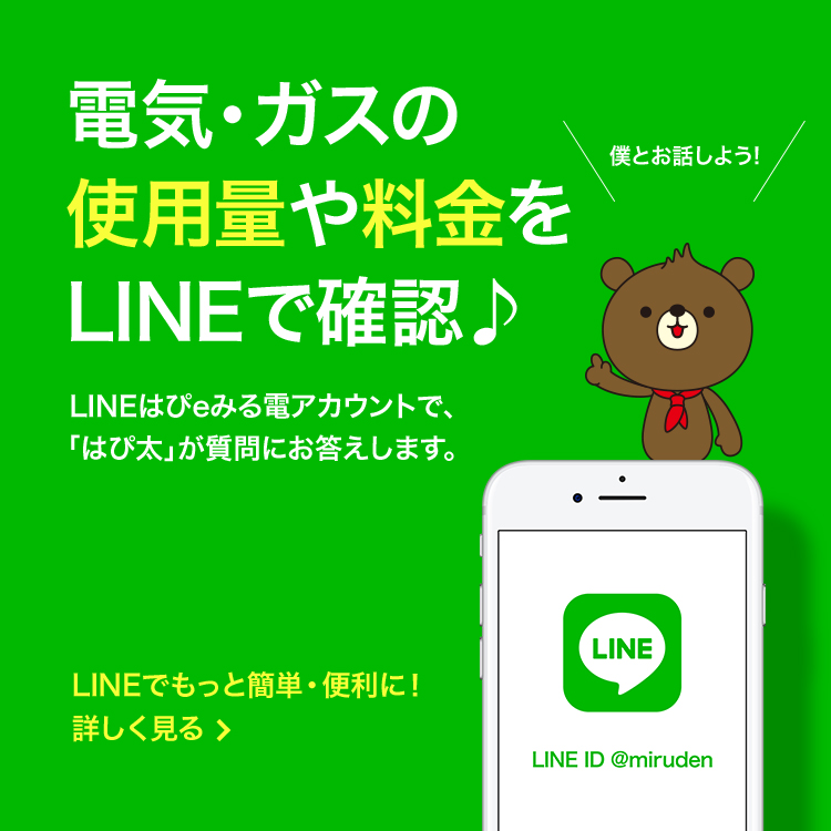 はぴeみる電トップ IDをお持ちの方 ログイン情報を保持する ログイン IDまたはパスワードを忘れた方はこちら その他のアカウントでログイン IDをお持ちでない方 新規登録 ログイン(新規登録) 「はぴeみる電」会員なら もっと便利、もっとお得! 電気・ガス料金がWeb上で いつでも確認できる! 最大過去25ヶ月の電気・ガス料金や使用量を分かりやすいグラフでチェックすることができます。また、月単位だけではなく、1日ごと・1時間ごとの使用量をチェックすることができます。 さらに、前日までの概算料金の表示に加え、次回検針日までの1ヶ月分の想定料金を表示します。 続きをみる+ 閉じる- 電気・ガス料金の 見直し・省エネ 電気・ガス料金メニューの変更シミュレーションや省エネに関するサービスをご紹介します。 続きをみる+ 閉じる- はぴeポイントがたまる!つかえる! 電気・ガスのご使用に応じたポイントや各種コンテンツのご利用によるポイントが簡単に、おトクにためていただくことができます。 また、電気・ガスへのお支払いや400種類以上のアイテム・他社ポイントへの交換、地域を盛り上げ社会に貢献することを目的とした活動への応援等に幅広くお使いいただくことができます。 続きをみる+ 閉じる- 暮らしのお役立ちサービス \はぴeみる電会員さま限定!/暮らしに役立つ、さまざまなサービスをご紹介します。 続きをみる+ 閉じる- 「はぴeみる電」についてもっと知る 「はぴeみる電」でできること 「はぴeみる電」よくあるご質問 お知らせ 2025年08月07日 キャンペーン 「選ぶなら、電気もガスも関西電力!」キャンペーンの実施中! 一覧をみる おすすめのサービス・キャンペーン お困りのとき・各種お手続き お困りのとき 各種お手続き はぴeでんきの駆けつけサービス ガス漏れを感じたとき 停電情報 雷情報 よくあるご質問 引っ越しのお手続き 他社からの切り替え(電気) 他社からの切り替え(ガス) 支払い方法に関するお手続き 電気の契約メニューのご変更 送電再開のお手続き お困りのとき 各種お手続き はぴeでんきの駆けつけサービス ガス漏れを感じたとき 停電情報 雷情報 よくあるご質問 引っ越しのお手続き 他社からの切り替え(電気) 他社からの切り替え(ガス) 支払い方法に関するお手続き 電気の契約メニューのご変更 送電再開のお手続き